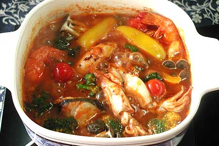 - 将切成薄片的大蒜,红辣椒倒入锅中,小火翻炒。加入水煮好的番茄(在锅中把番茄煮烂)煮好后,加入已准备好的步骤1,2中的食材,翻炒出香味后,加水至锅的4/5,撇除浮沫,煮熟后加盐,胡椒进行调味即可。
